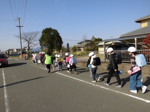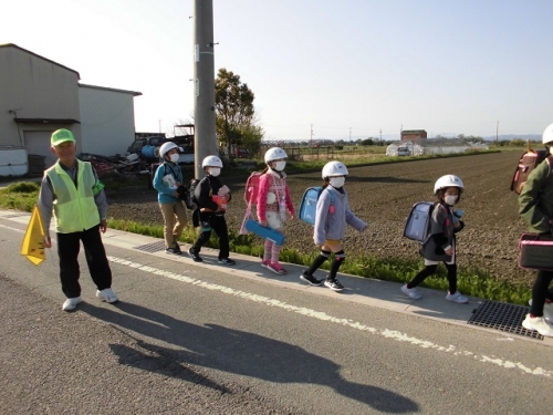 7日から1年生も通学団で元気に歩いて学校に来るようになりました。交通の要所には見回り隊の方が立ってくれていたり、遠い道のりを学校まで共に歩いてくれています。本当にありがとうございます。見回り隊は常時募集しておりますので、協力いただける方は学校までお知らせください。