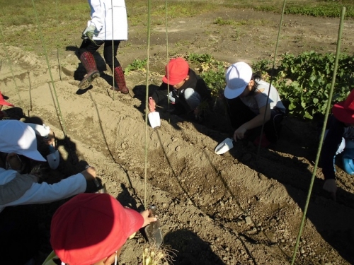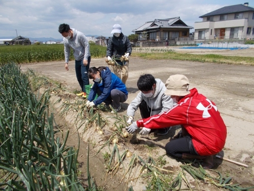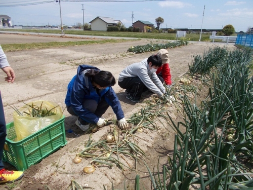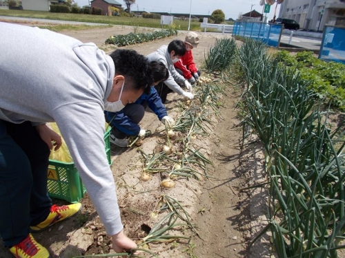 学校の前の畑で、2年生が1年生の時に苗を植えて、地域の方にお世話をしてもらっていたたまねぎが大きく実りました。休業中のため、先生たちに一部を収穫してもらいました。まだもう一列残っていますので、5月に学校が始まったら子どもたちに収穫してもらおうと考えています。栄養をしっかりとって、病気に負けない身体をつくりましょう。地域のみなさんありがとうございます。