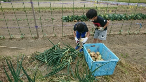 学校の前の畑の二年生が植えた玉ねぎが実り、今日は親子で収穫してもらいました。地域の方に大切に育てていただいたのでとても大きく実りました。たくさん持ち帰ってもらいました。久しぶりの再会に嬉しそうな子もいました。しばらく食卓は玉ねぎ関連のメニューが続きそうです。明日4日も10時~12時に2年生は収穫できます。まだの方はお越しください。申し訳ありませんか、無くなり次第終了となります。