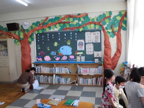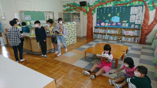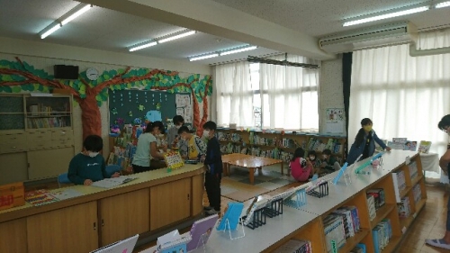 昨日の雨で運動場にはみずたまりが。朝学校に来た子どもたちは外で遊べないので、図書室に本をさがしに来ていました。休校中に、先生たちが本だなの飾りつけをしてくれていました。この機会に読書習慣がつくと良いですね。今日も2限後10時40分に通学団別に帰ります。