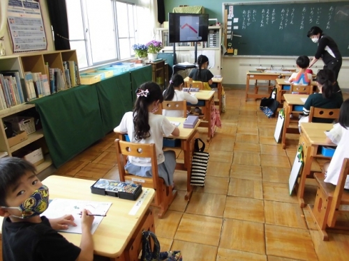 今日も全員が学校に来ました。1年生が正しい姿勢でひらがなの学習。2限目は2年生は算数、3年生は理科の授業でした。以前のようにはまだまだ戻れませんが、少しずつ3密を避ける学校生活に慣れていきましょう。