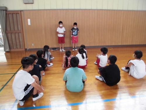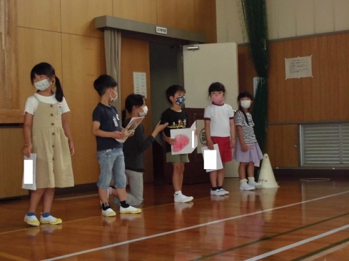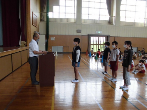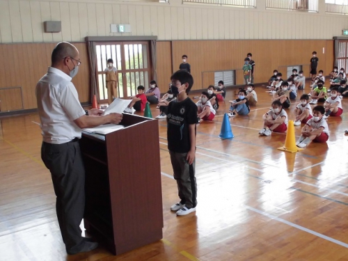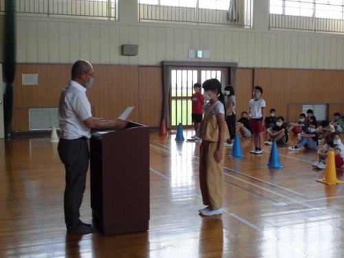 3日(水)全校児童が体育館に集まって認証式と、1年生の紹介を行いました。入学後2か月が経っていますが、1年生はあらためて2年~6年の前で自己紹介をしました。大きな名刺には自分の好きな物と名前が書いてありました。みんなの前で元気に自己紹介できました。5,6年生は認証式で、1年生によい見本を見せてくれました。児童会の会長、副会長、書記2名は自分の思いをみんなの前で話すことができました。リーダーを中心にコロナに負けずよい学校にしていきましょう。学級委員、児童会委員会委員長、通学団長にも認証状を渡しました。がんばりましょう。