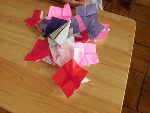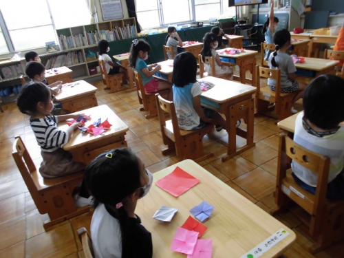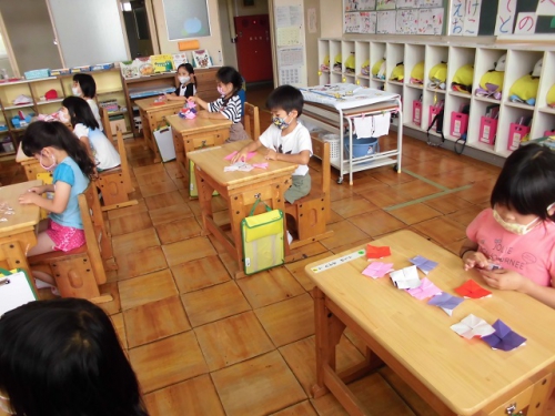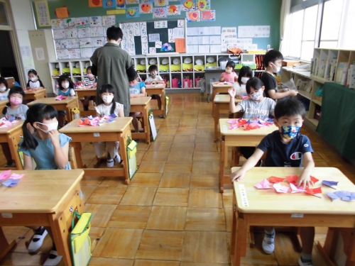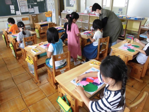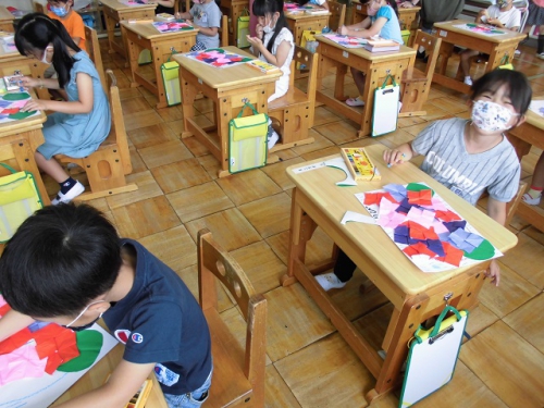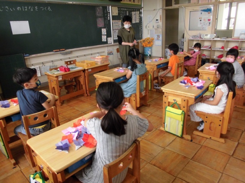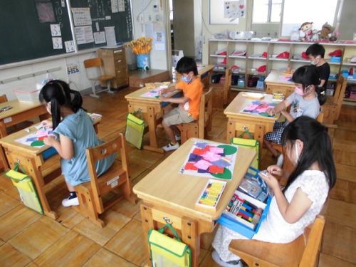 1年生は図工の時間に折り紙を使ってあじさいの花を作りました。あじさいは小さな花がいっぱい集まって、とてもやさしい色の花を作り上げていますね。子どもたちはあじさいの花を一つ一つのりで画用紙に貼って、あじさいを完成させました。6月はあじさいがきれいに咲く季節です。実は学校の敷地にもあじさいが咲いているんですよ。何色のあじさいが咲いているか探してみてくださいね。
