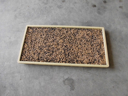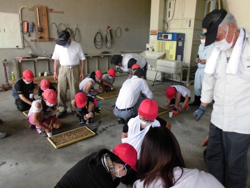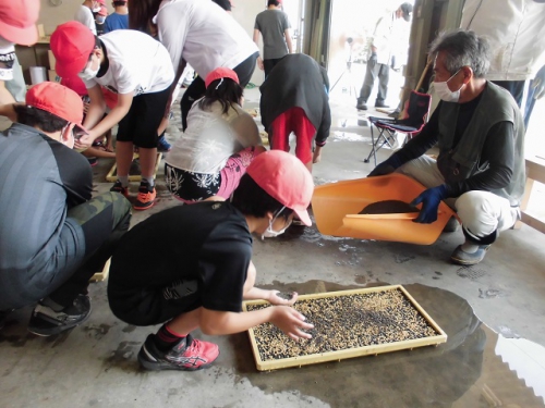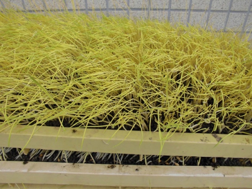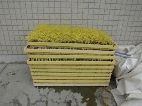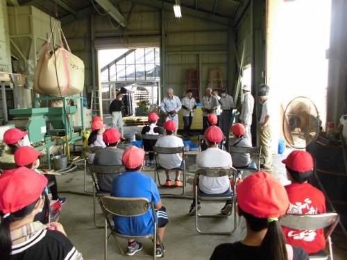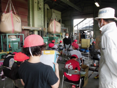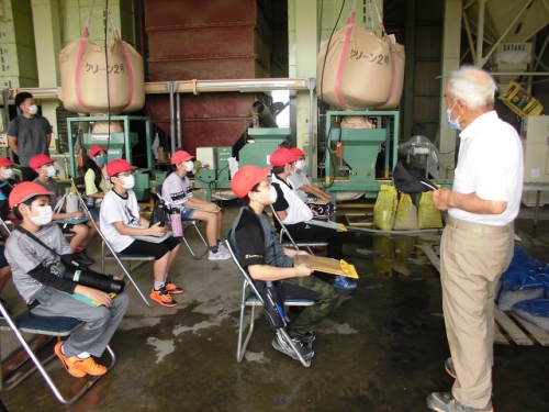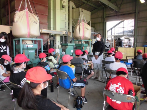 米づくりを学習する5年生は、飼料米のもみまきを学習しに行きました。徒歩20分ほどの営農組合の作業倉庫で、地域の方々から米づくりについて教わりました。今年はコロナで学校休業があって、予定していた田植えができませんでした。しかし地域の方々のはからいで、飼料米のもみまきと田植えを体験させていただくことになりました。今日植えたもみが生長して苗になり、その苗を5年生が7月に田植えする予定です。苗床にまいた一粒一粒のもみが、芽を出して苗となり、さらに成長してたくさんの米になるのです。帰りに稲刈りする田を見に行きました。