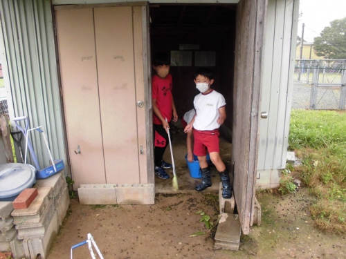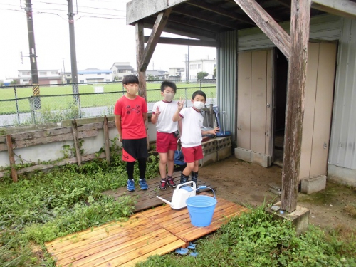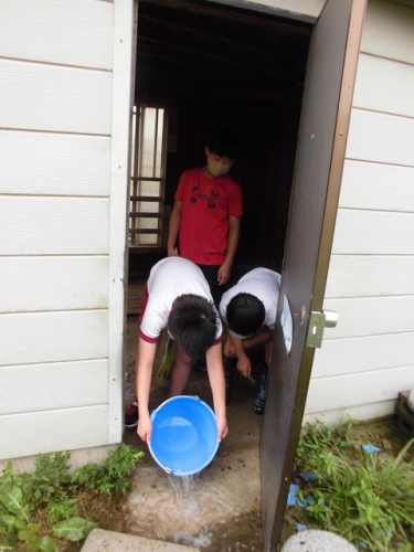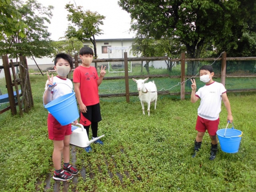 毎朝飼育委員会の当番がメイカの小屋の掃除をしてくれています。メイカのウンチは奈良公園の鹿のようにチョコボール状で、ほとんどにおいはしません。朝行くといろんなところにウンチが落ちています。当番はメイカにエサをあげて、メイカがエサを食べているうちに要領よく掃除しなければなりません。バケツの水も替えます。小屋がきれいになってメイカも嬉しそうですね。