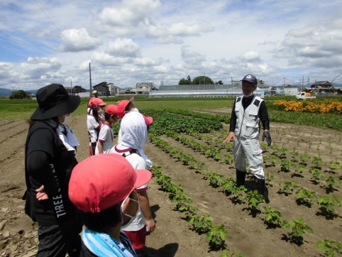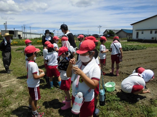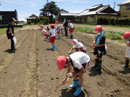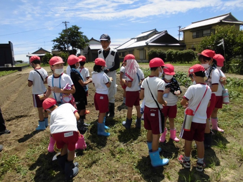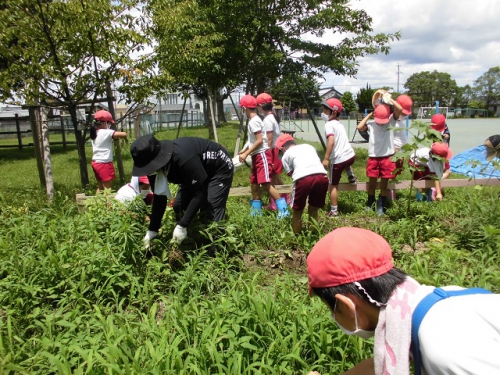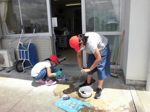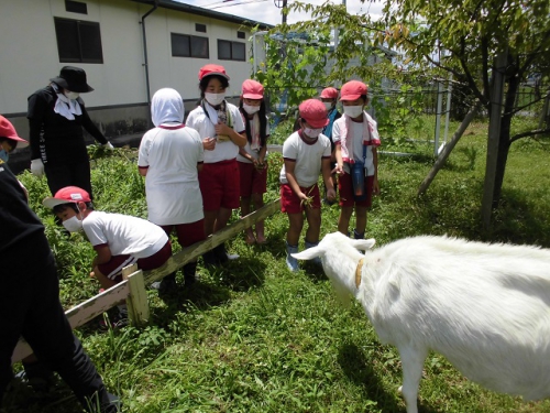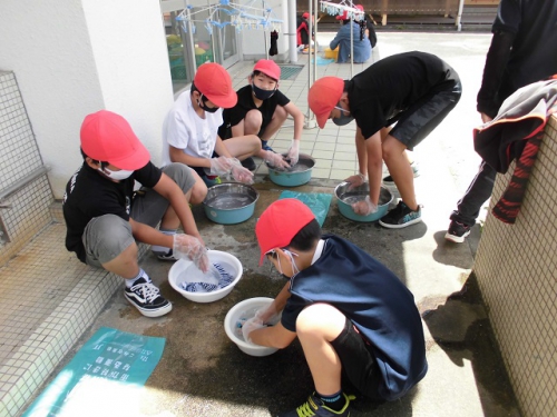 3年生は地域の方にお世話になって大豆の種をまきました。先週からの雨で、今週に延期されましたが、地域の方が朝から大豆を育てる畑を用意してくれました。隣の畑にはすでに成長して大きくなりつつある大豆があり、自分達がまいた大豆がどのように大きく育っていくのか想像することができました。地域の方にお礼を言った後、学校に帰って自分達の学級園の除草をしました。外につないであった山羊のメイカに抜いた草を食べてもらいました。 6年生は家庭科の授業で洗濯をしました。密にならないよう、個別に洗い桶を用意して、靴下を洗って干しました。今日はよく乾いたことでしょう。