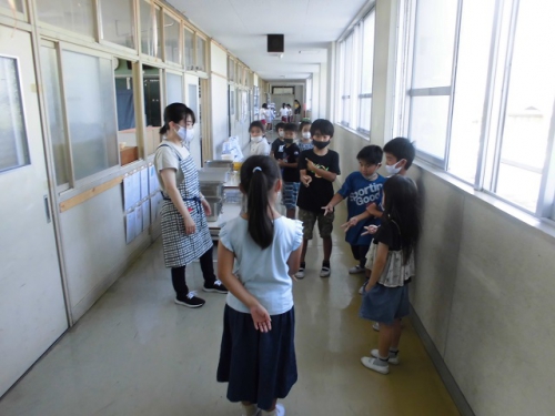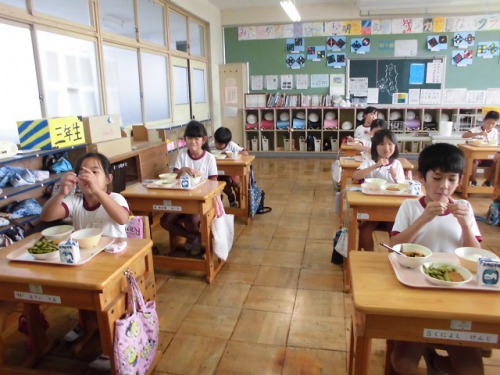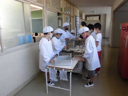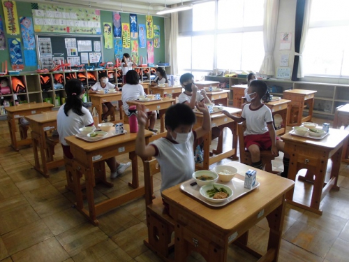 今週に入って、給食が始まりました。猛暑の中ですが、平常事業を実施しています。教職員にとりましてもこの時期に授業を行うのは初めてのことでありますが、熱中症に十分に注意して学校生活が送れるようしていきたいと思います。コロナウイルス感染拡大を防ぐため、各教室での喫食を継続して行っていきます。昨日はカレー、今日は枝豆とカボチャコロッケ、明日はハンバーガーで子どもの好きなメニューが続きます。