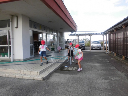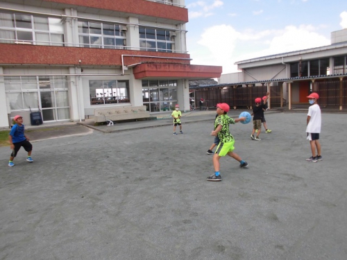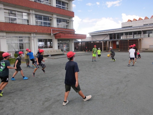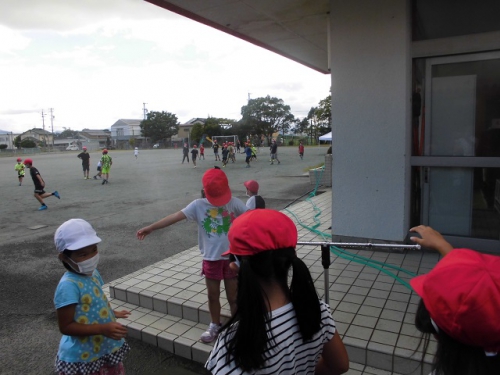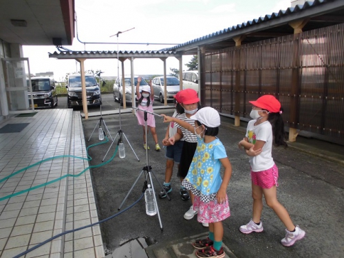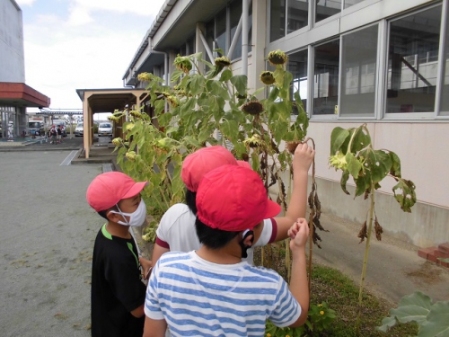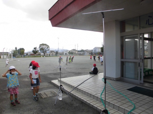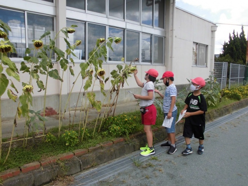 朝方の豪雨で運動場は水浸しとなっていました。雨が止んで数時間で運動場から水たまりは消えて、お昼休みには外で遊べるような状態になっていました。熱中症対策として児童昇降口前にミストシャワーを設置しました。朝暑い中、学校へ来たときとか、外で遊んだ後など暑さをクールダウンしてくれるものです。理科の観察でヒマワリの種を見ている子もいました。