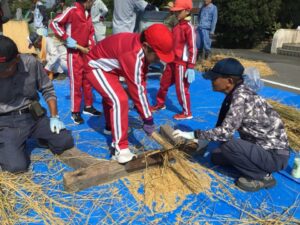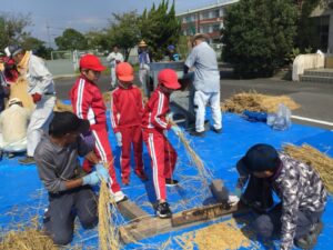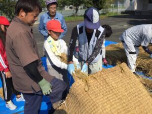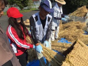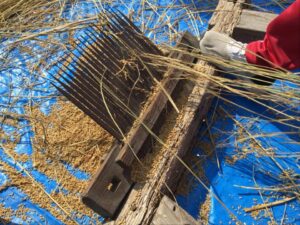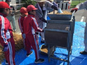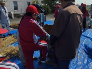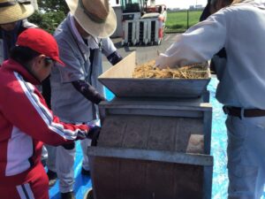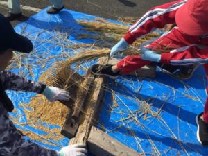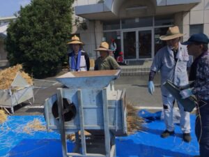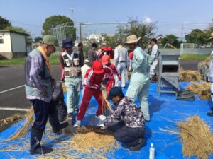 笠松営農組合のみなさんにお世話になって昔ながらの足ふみ脱穀や千歯こきで脱穀しました。