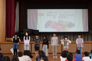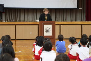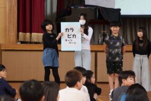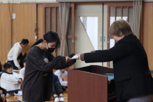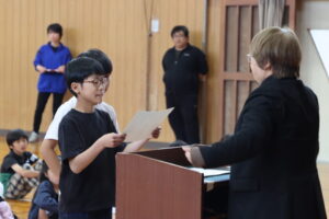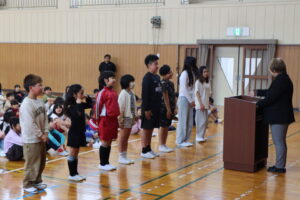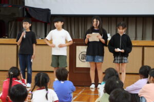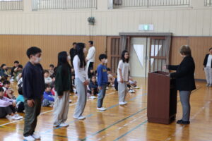 前期児童会役員の認証式。学校を楽しくするために盛り上げてください。
